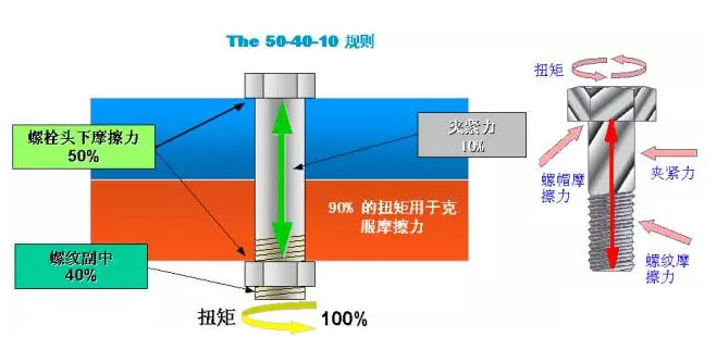 參見圖A:通常情況下,在螺栓的擰緊過程中,實際轉化為螺栓夾緊力的扭矩僅占10%,其余50%用于克服螺栓頭下的摩擦力,40%用于克服螺紋副中的摩擦力,這就是“541”規則,主要反映夾緊力與摩擦力之間的關系。但若施加一定的改善措施(如涂抹潤滑油)或螺紋副中存有缺陷(如雜質、磕碰等),該比例關系會受到不同影響而改變。